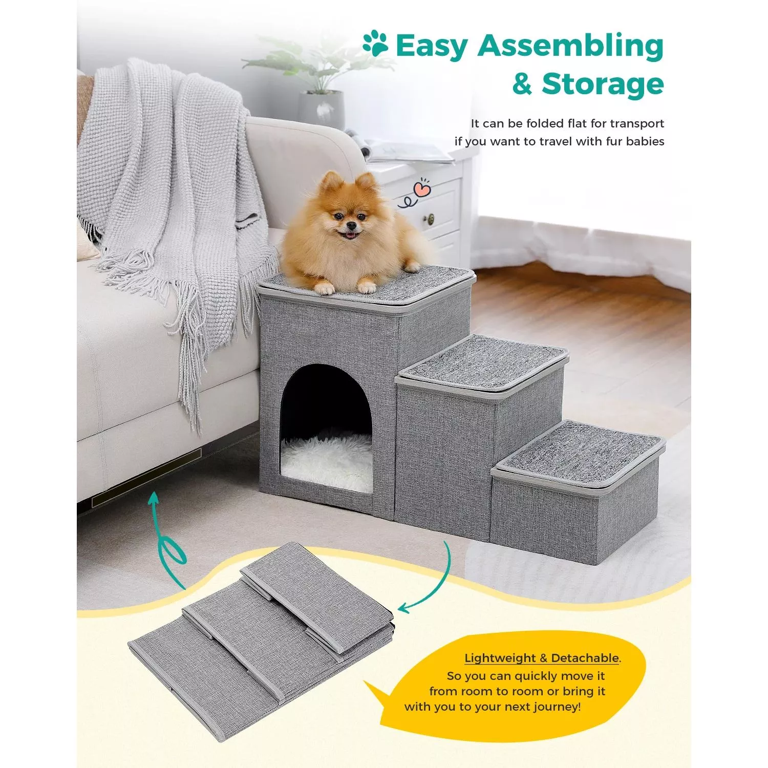 Crafted with high-quality materials, including a sturdy wooden frame and soft, supportive padding, these pet steps are built to last. The 2-in-1 design means that it’s not just a set of stairs—it’s also a convenient sleeping nest and a handy storage box for your pet’s toys and essentials. The foldable design ensures that the stairs don’t take up unnecessary space, making them easy to store when not in use. Ideal for small dogs, cats, and even puppies, this product is perfect for helping your pet climb onto beds, sofas, or any other elevated surfaces with ease.